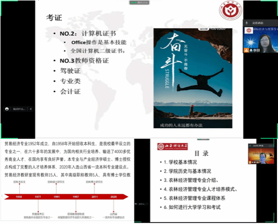 第二阶段是专业教育。国际经济与贸易教研室主任李丽老师、贸易经济教研室主任杨兴夏老师、国际商务教研室主任刘青云老师和农林经济管理教研室主任曹先磊老师向新生简要介绍秀人网概况