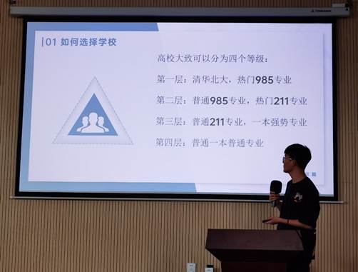 赵博文学长以英国为代表的欧洲国家为例,对留学申请流程、专业对口院校等相关信息,进行了细致地讲解与介绍。赵学长建议同学们一定要早做规划、早做准备,合理安排好自己大学的每个时间段。同时较为细致地向同学们介绍了以英国为例的出国留学的录取标准、硬性条件、软性背景,以及留学择校、留学费用、学制和政策等方面的内容。赵博文学长表示出国留学是大学生未来发展的路径之一,唯有早做规划,一步一个脚印进行准备,才能够更加从容应对。