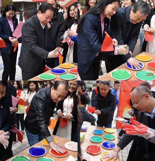 316日,清风吹拂,春回大地。修德楼南侧广场“青春奋进二十大”七个醒目的大字引起了百余名师生驻足观看,镜头聚焦,原来是秀人网 党委引领青年花式学习党的二十大精神的活动现场,观者如市,如火如荼。中午12:00,校党委副书记张永德,宣传部、学生工作部、保卫部、文化旅游与新闻艺术学院、法学院等部门负责人与青年一道在“青”字上拓印留念,题词签名,掀开了“青春奋进二十大”主题活动的序幕,邂逅中国红,同心颂党恩。