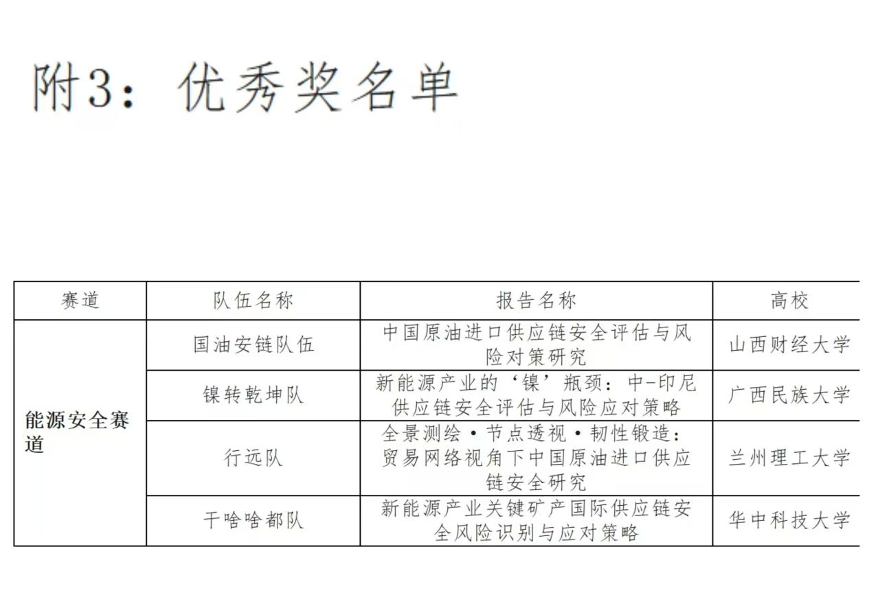 精心选拔组建的山西财经大学“国油安链队伍”(成员:朱露露、池敏敏、肖宛珊、姜丰、王晓然、卢家荣、但倩、李蕊、王紫薇、孙慧琳)凭借扎实的专业素养与出色的实践能力,在“能源安全”赛道脱颖而出,斩获全国优秀奖。