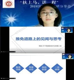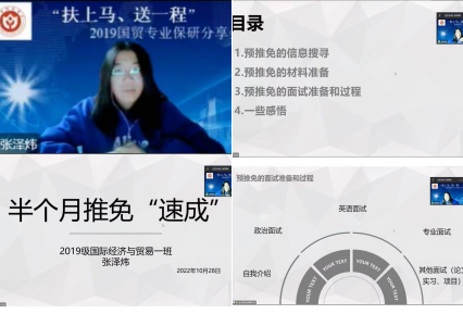 10月29日晚19:00-21:00,国际贸易与经济教研室利用腾讯会议举行了国际经济与贸易专业线上保研分享会,分享会邀请了2019级国际经济与贸易专业推免至同济大学教育学专业的韩妮同学、推免至中南财经政法大学国际商务专业的娄薪宇同学和推免至南京师范大学国际商务专业的张泽炜同学进行了分享,2020级、2021级和2022级国际经济与贸易专业100名学生参加了分享会。