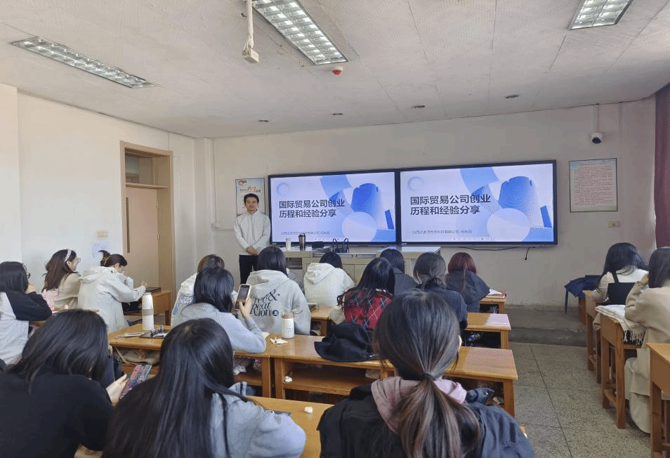讲座伊始,闫董事长以创业背景与历程为切入点,为同学们展开了一场生动形象的讲解。他回顾了自母校毕业后所经历的多个选择与挑战,最终萌生创业想法,并通过不懈努力做出成绩,取得辉煌成就的过程。随后,闫光羽董事长从国际贸易流程中的选品、市场权重分布、货代等关键环节入手,结合国际贸易链条中的公司角色,通过具体创业案例与经验分享,为同学们提供了针对性的指导。此次分享会特别增设了互动环节。同学们踊跃提问,针对创业过程中的资金筹集、市场定位、客户沟通等实际问题与闫董事长进行了积极的交流。互动环节不仅加深了学生们对创业知识的理解,也拉近了校友与在校生之间的距离。